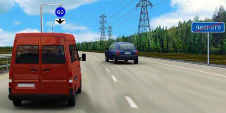 #5. Ճանապարհային նշանների, գծանշման և բաժանարար գոտու բացակայության դեպքում վարորդները երկկողմ երթևեկությամբ ճանապարհների երթևեկելի մասում գտնվող ճանապարհային կառույցների տարրերը պետք է շրջանցեն`։